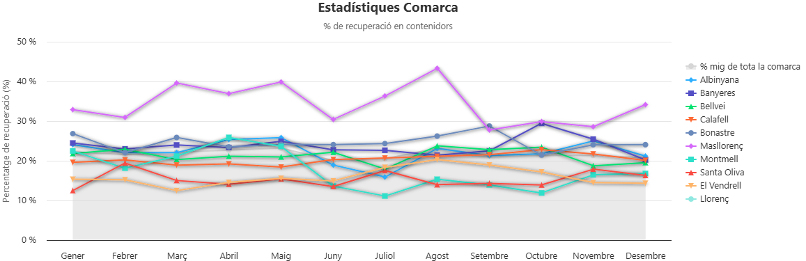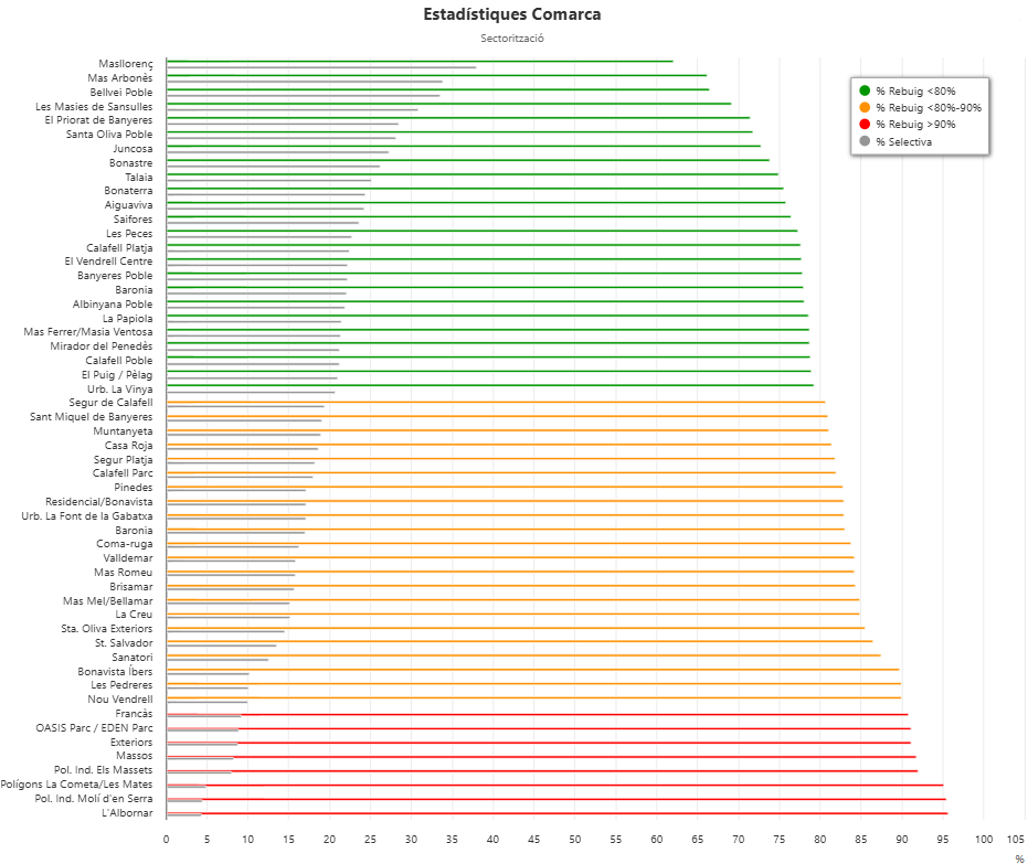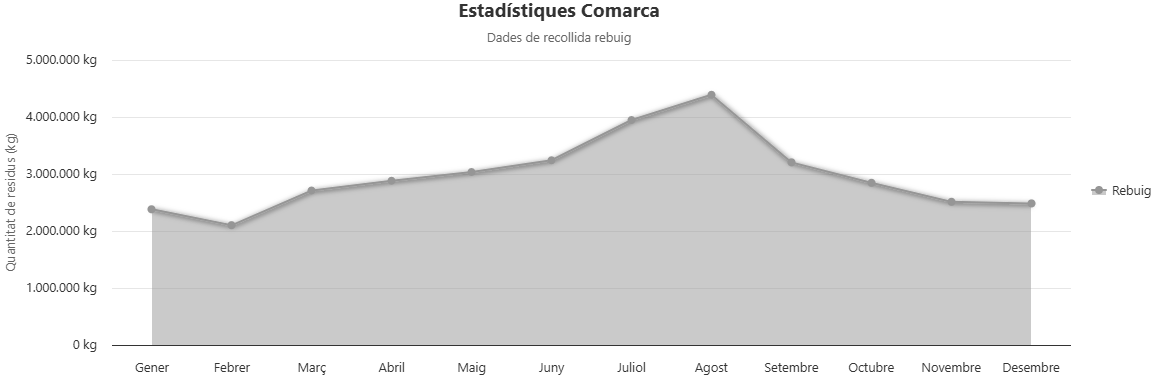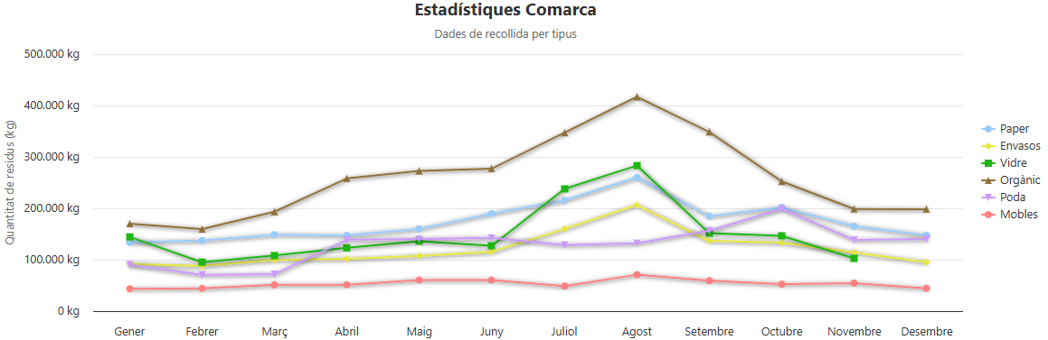 Escull el municipi del qual vols consultar l'estadística de recollida de residus. Sota dels botons hi trobaràs l'estadística total comarcal: