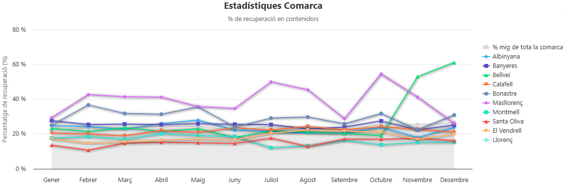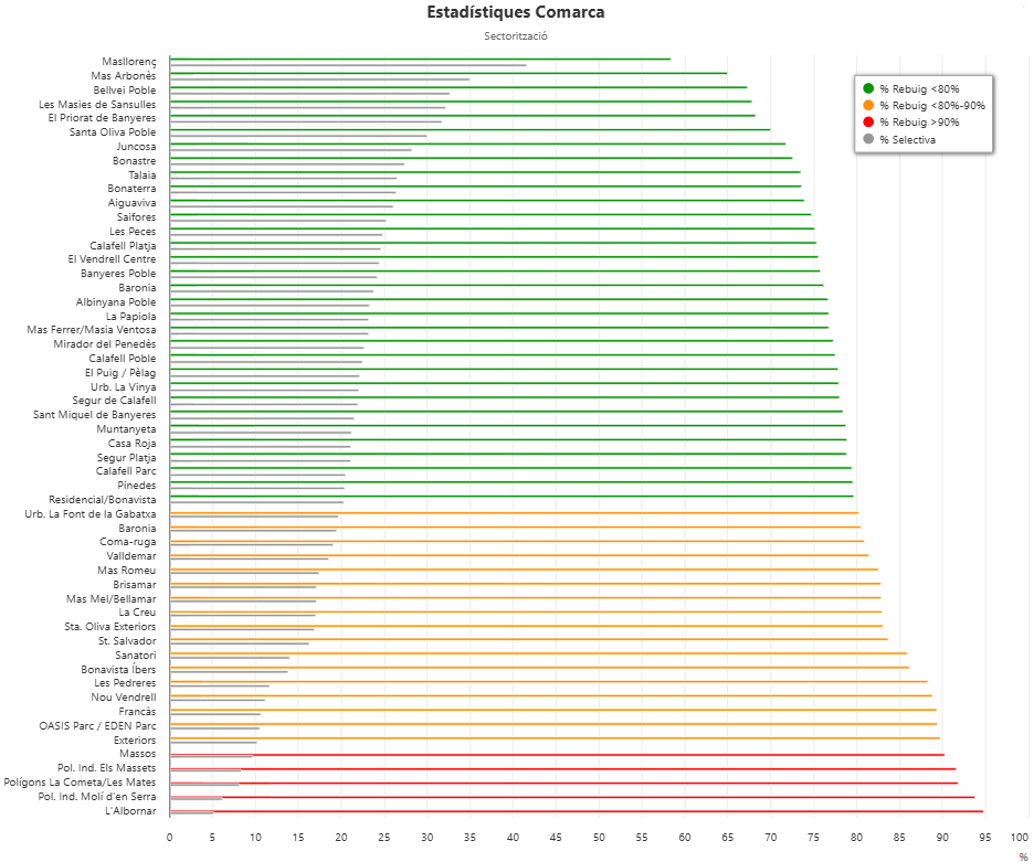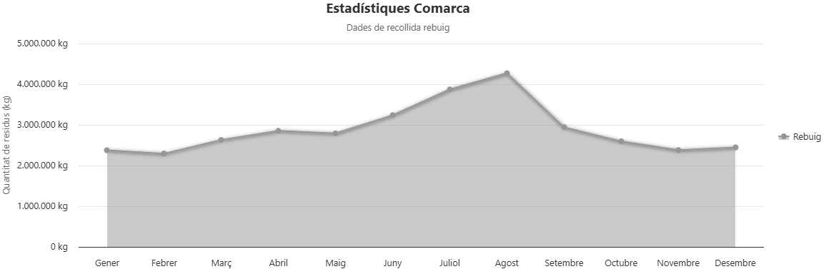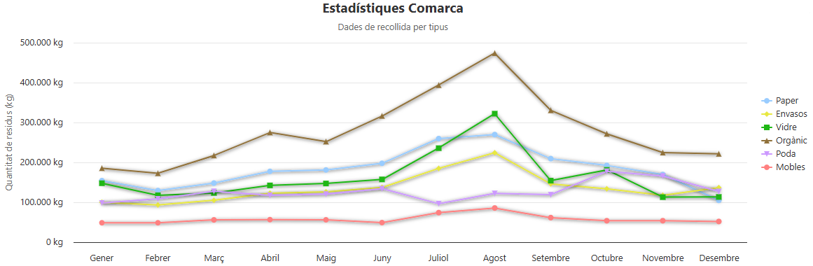 Escull el municipi del qual vols consultar l'estadística de recollida de residus. Sota dels botons hi trobaràs l'estadística total comarcal: